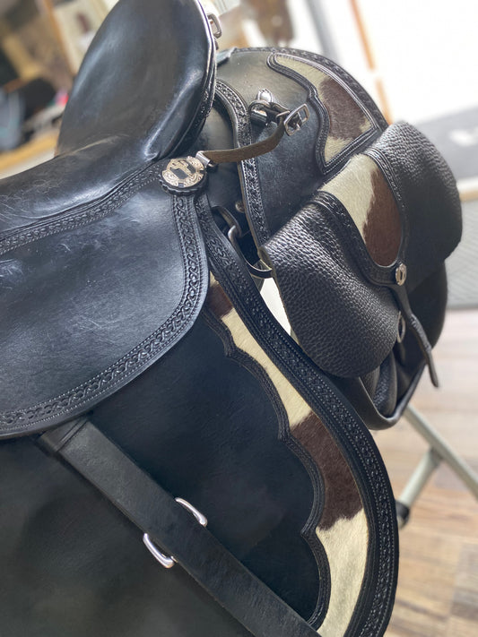 Pre-Loved Customized Cowhide Overlay Detail Black Saddle Western Eli Miller 105 Handcrafted Custom 17” w/ Cactus Conchos Matching Insulated Saddle Bags, Aussie Pulling Collar, Bridle w/ Reins