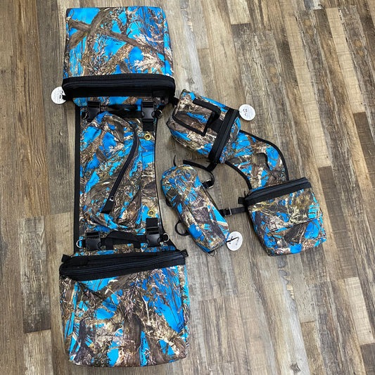 3 Piece Set Amish Made Blue Camo Detachable Saddle Bags, Horn Bags w/ Drink Holder & Pommel Bag