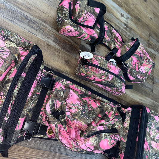 3 Piece Set Amish Made PINK CAMO Detachable Saddle Bags, Horn Bags w/ Drink Holder & Pommel Bag