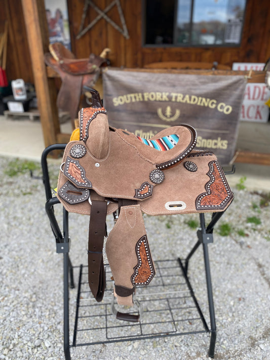 NEW DOUBLE T YOUTH 12” Rough Out Barrel Style Saddle w/ Western Southwest Serape Printed Inlay