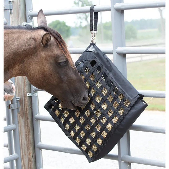Make feeding time effortless with the patented Weaver 45 Degree Hay Bag. Its innovative side-loading design allows you to easily add multiple flakes. Just open the flap, slide in the hay, and secure it with the heavy-duty hook and loop closure. Ideal for use at home or while traveling!
