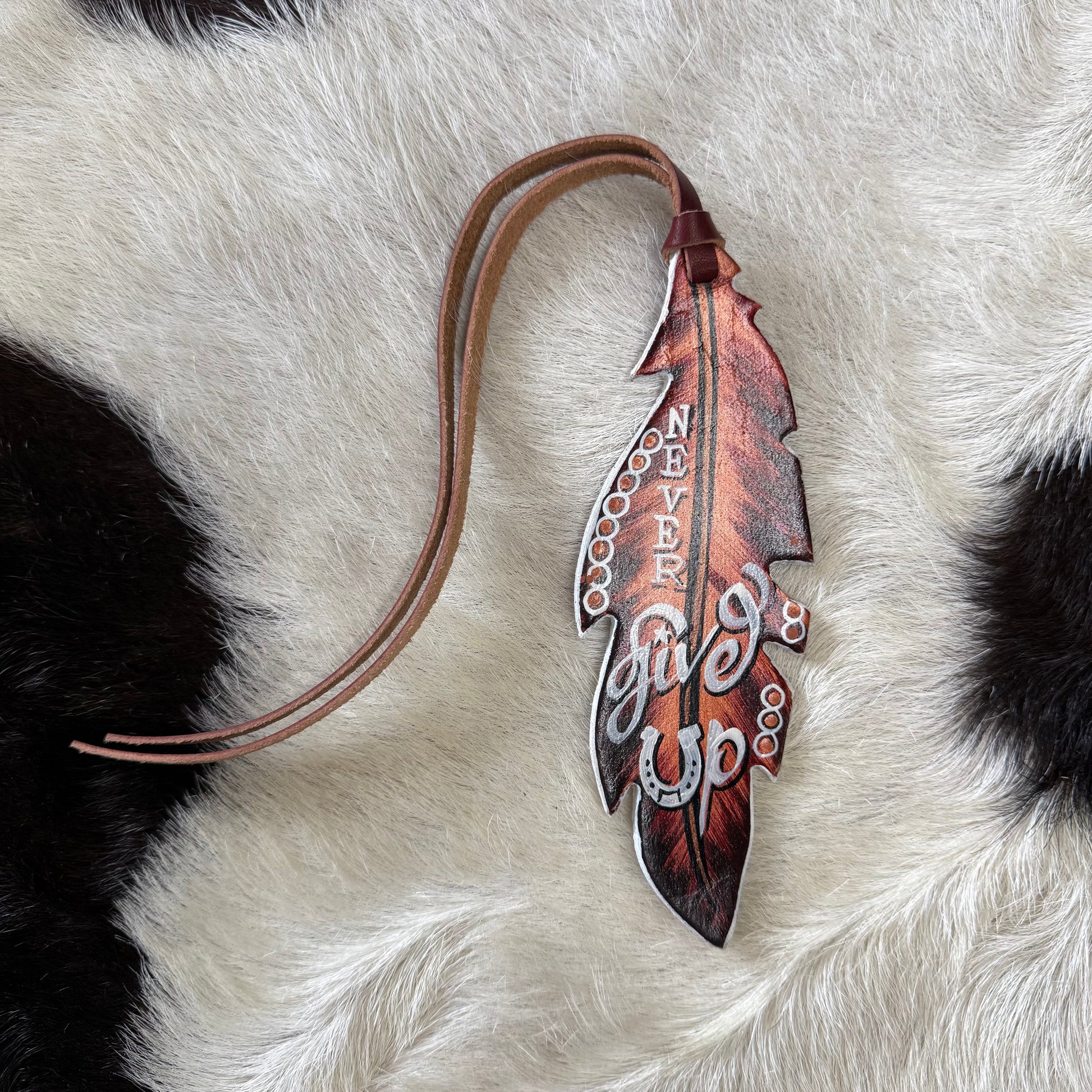 Leather Feather NEVER GIVE UP Tie-On Saddle Charm Amish Crafted