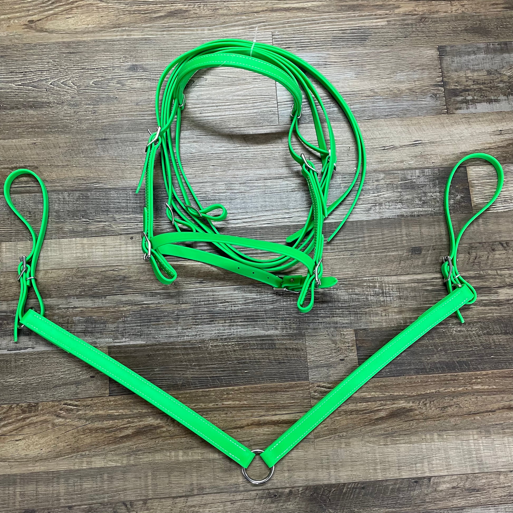 NEON GREEN Beta Bridle w/ Nose Band, Reins & Matching 2 Point Breast Collar Amish Crafted