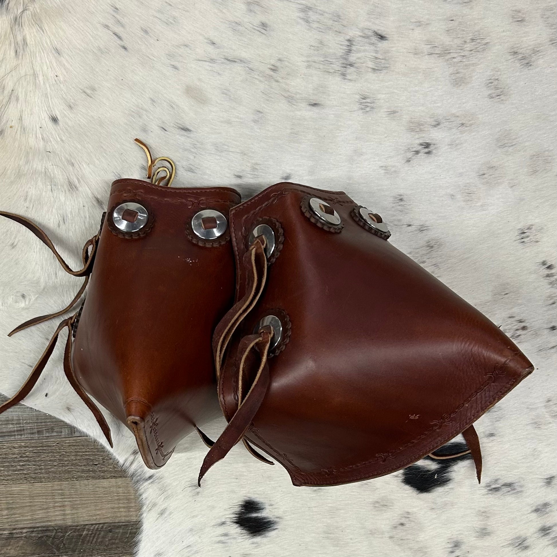 Schwartz Western Leather Stirrups Amish Crafted Brown Covered Leather Barbed Wire Tooling With Fringe & Conchos