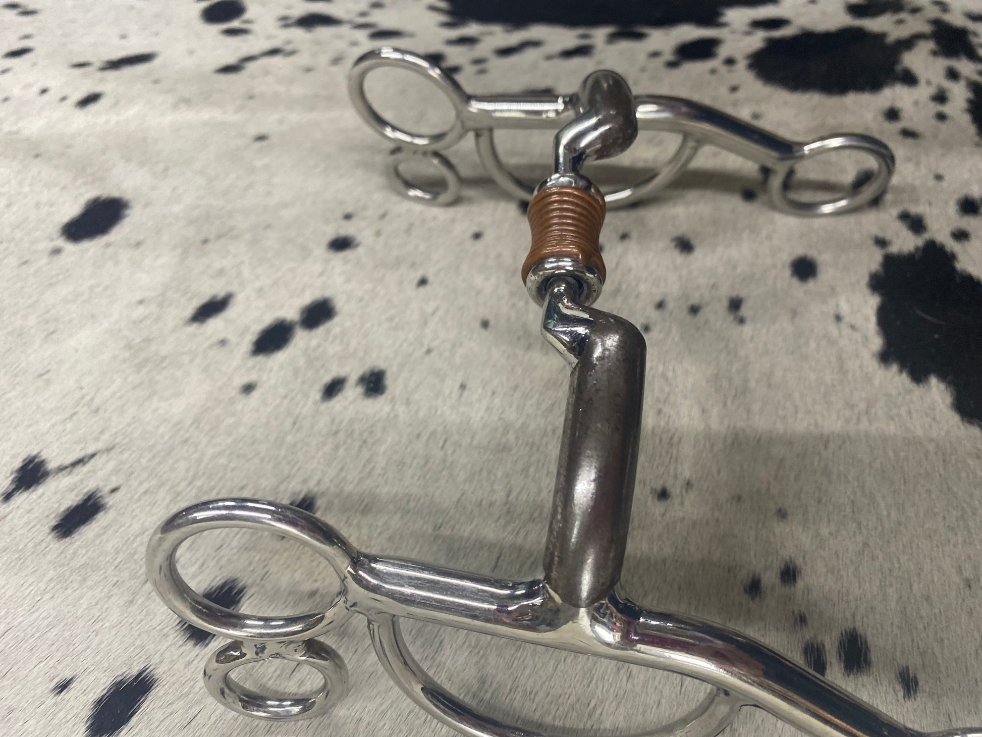 The USED Sweet Iron Copper Roller Shank Bit with Double Moving Joints is a rare find, featuring slight rust and dirt that do not affect its functionality. This bit offers enhanced maneuverability due to its double moving joints, facilitating better communication between horse and rider. Its construction promotes a comfortable fit for your horse, ensuring effective performance in various riding situations.